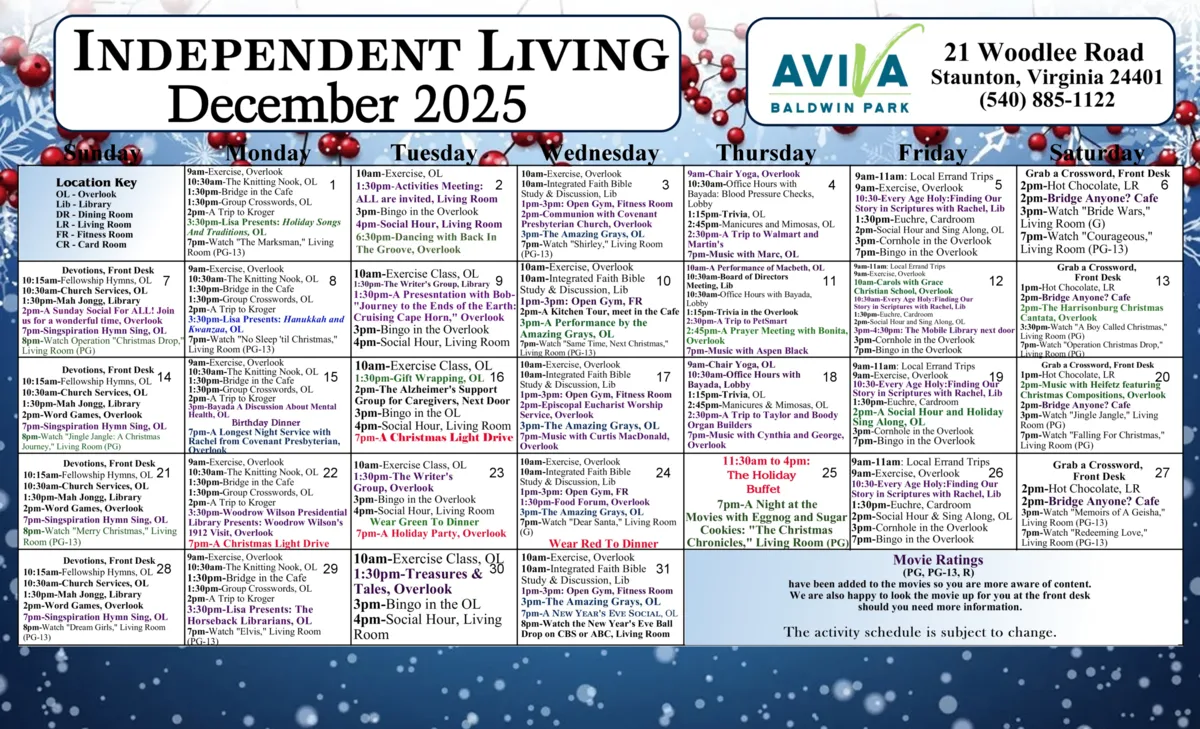You or your loved one is our top priority at AVIVA Baldwin Park in Staunton, VA. Our community is crafted to enhance their senior living experience, offering professional care and a vibrant lifestyle tailored to their needs. Nestled in the scenic Shenandoah Valley, AVIVA Baldwin Park provides a serene and nurturing environment where residents can thrive. We offer independent living, assisted living, memory care, and respite care services, ensuring a seamless continuum of care within a community that feels like home.